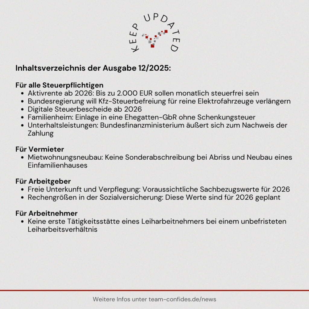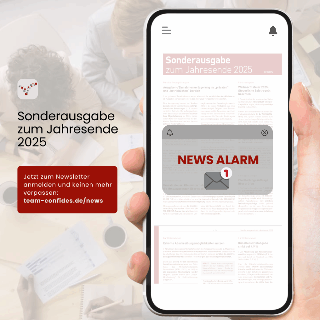 Bitte dieses Feld leer lassenAbonnieren Sieunseren Newsletter Monatliche Steuerinformationen Wir senden keinen Spam! Erfahren Sie mehr in unserer Datenschutzerklärung. Prüfe deinen Posteingang oder Spam-Ordner, um dein Abonnement zu bestätigen. Aktueller Newsletter Dezember Sonderausgabezum Jahresende 2025 Newsletter-Archiv 2023 Sonderausgabe zum Jahresende 2023 Dezember November Oktober September August Juli Juni Mai April März Februar Januar